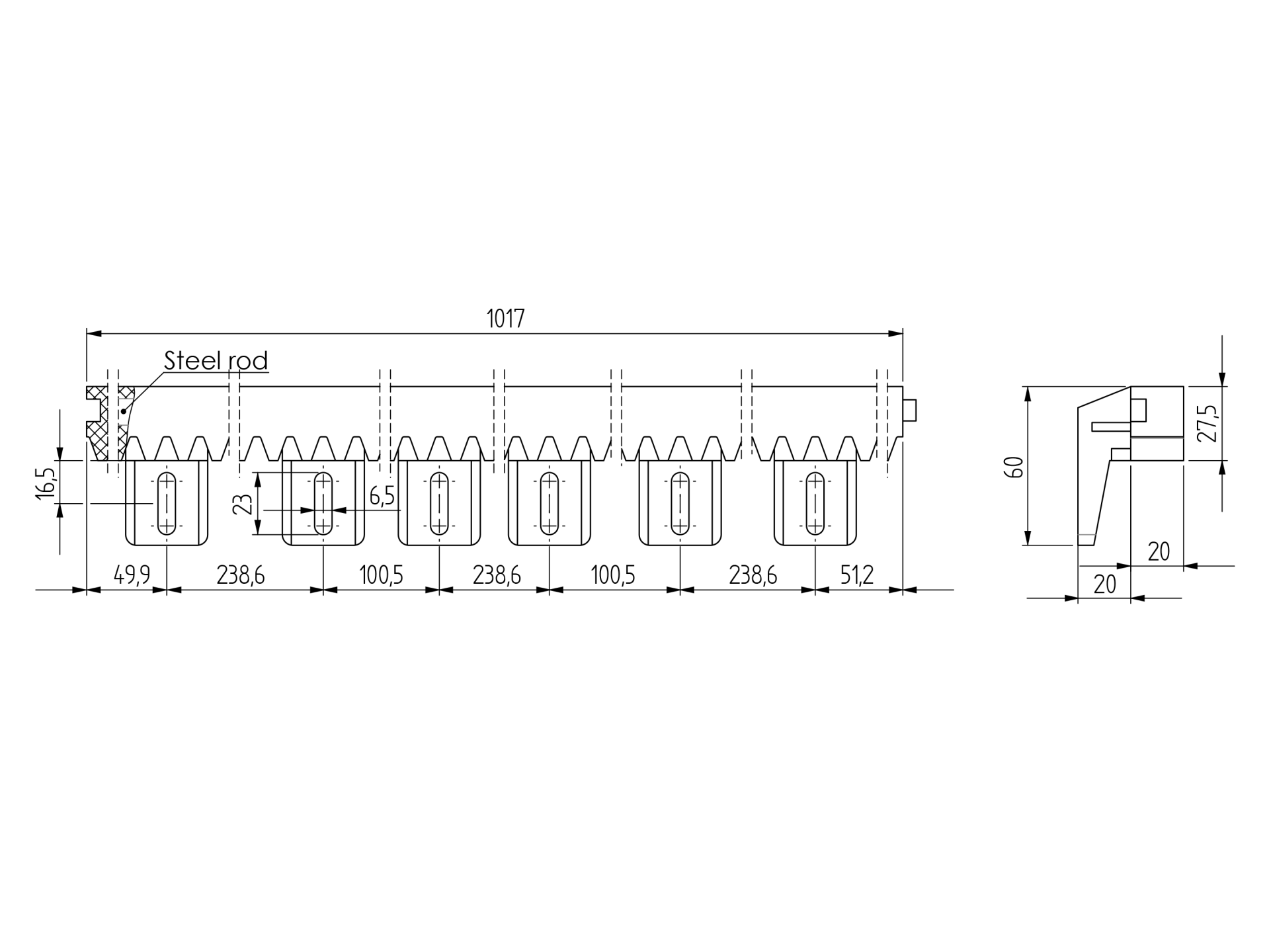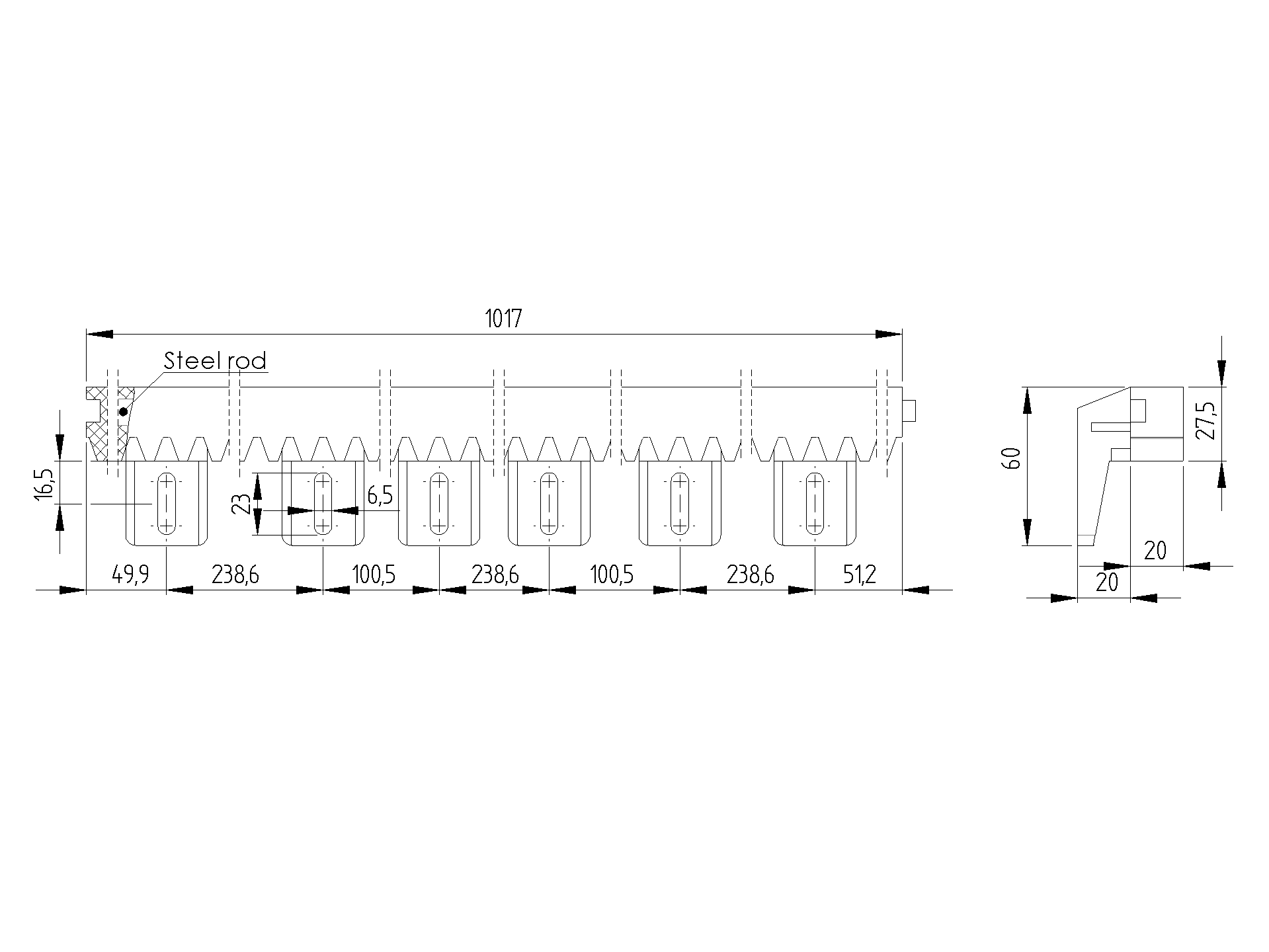 Lowest price in the last 30 days: €8,45 without VATIn stock (17779 units)Tooth rack PVC+Fe,27x20mm,L1m,max 1200kg H/01PVC-S-BS