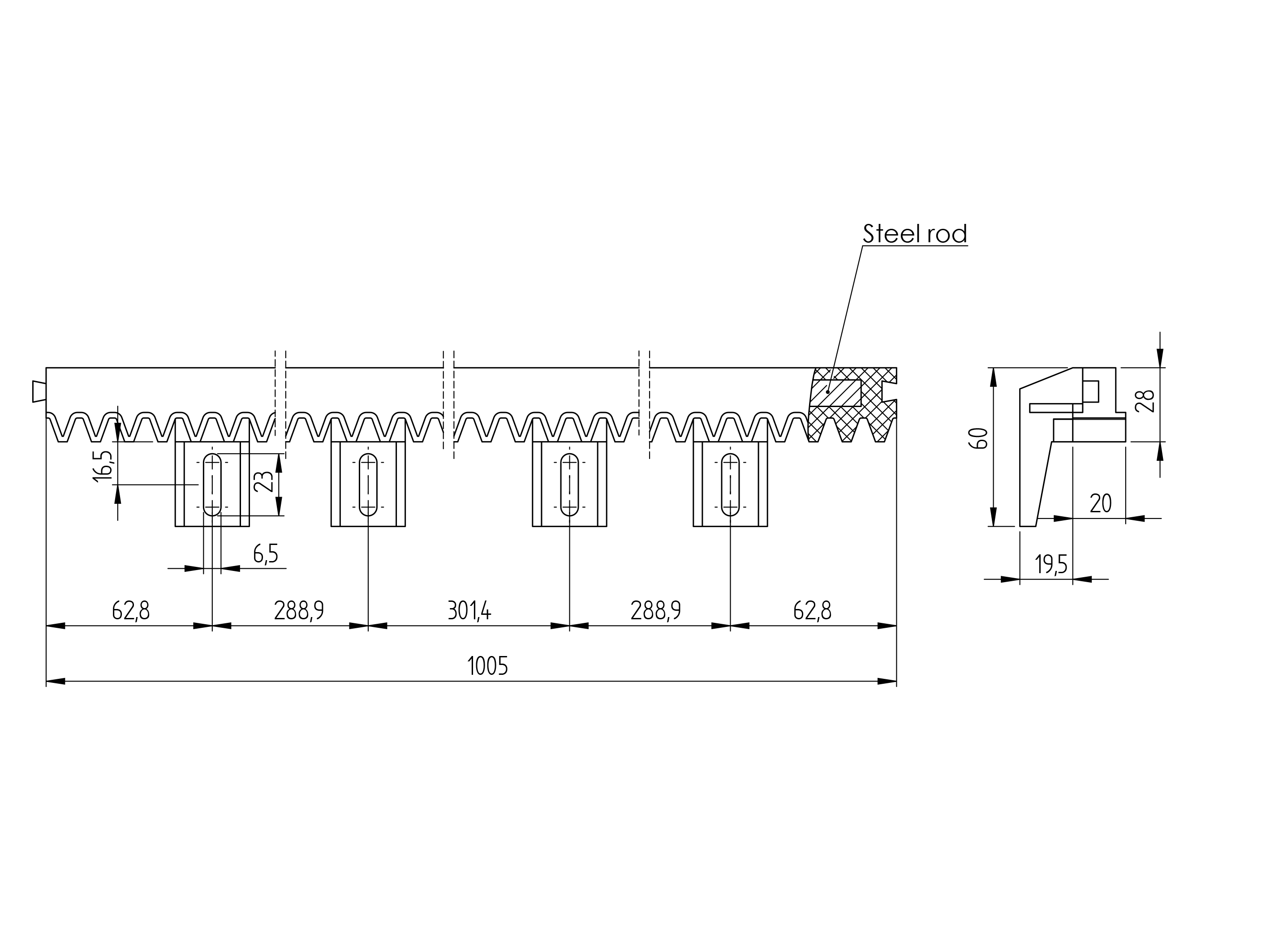 1 pcsMaterialSteelSurface finishGalvanizedTooth rack PVC+Fe,27x20mm,L1m,max 1200kg H/01PVC-S-BS