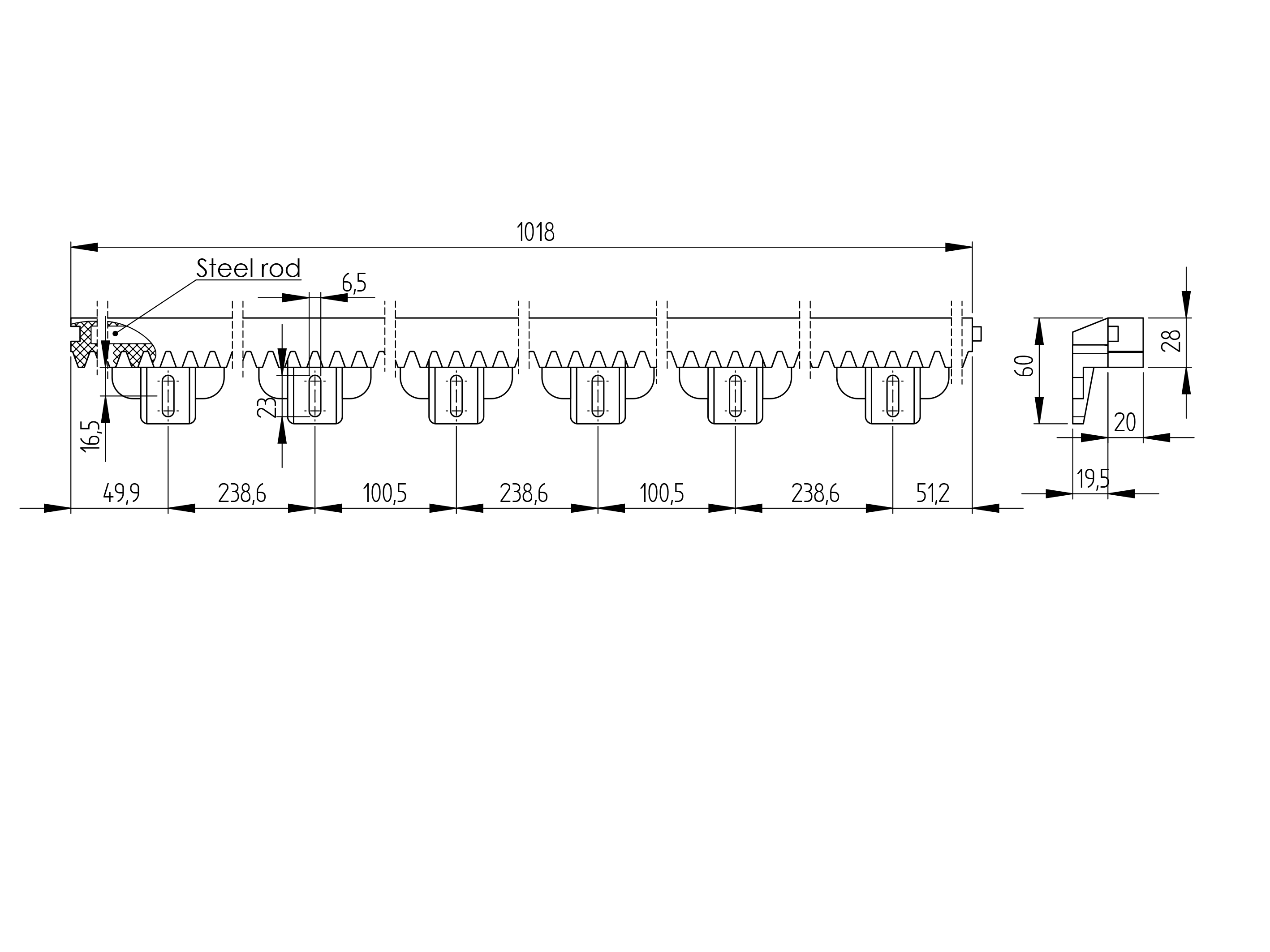Lowest price in the last 30 days: €8,45 without VATIn stock (17779 units)Tooth rack PVC+Fe,27x20mm,L1m,max 1200kg H/01PVC-S-BS