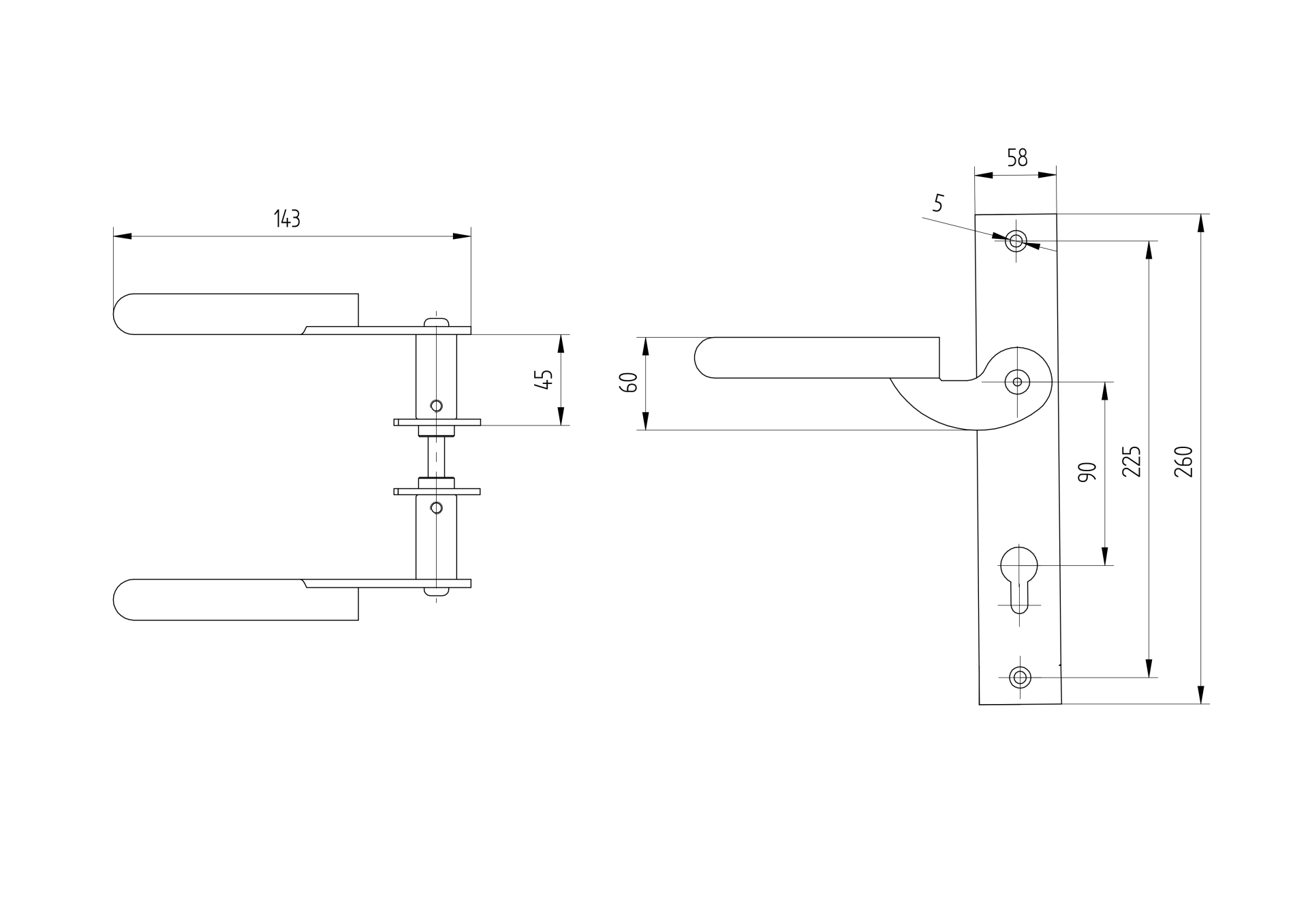 1 pcsMaterialSteelSurface finishRawAxial distance90mmDoor handle with plate - right h260, b60, t3mm D12/07R-90