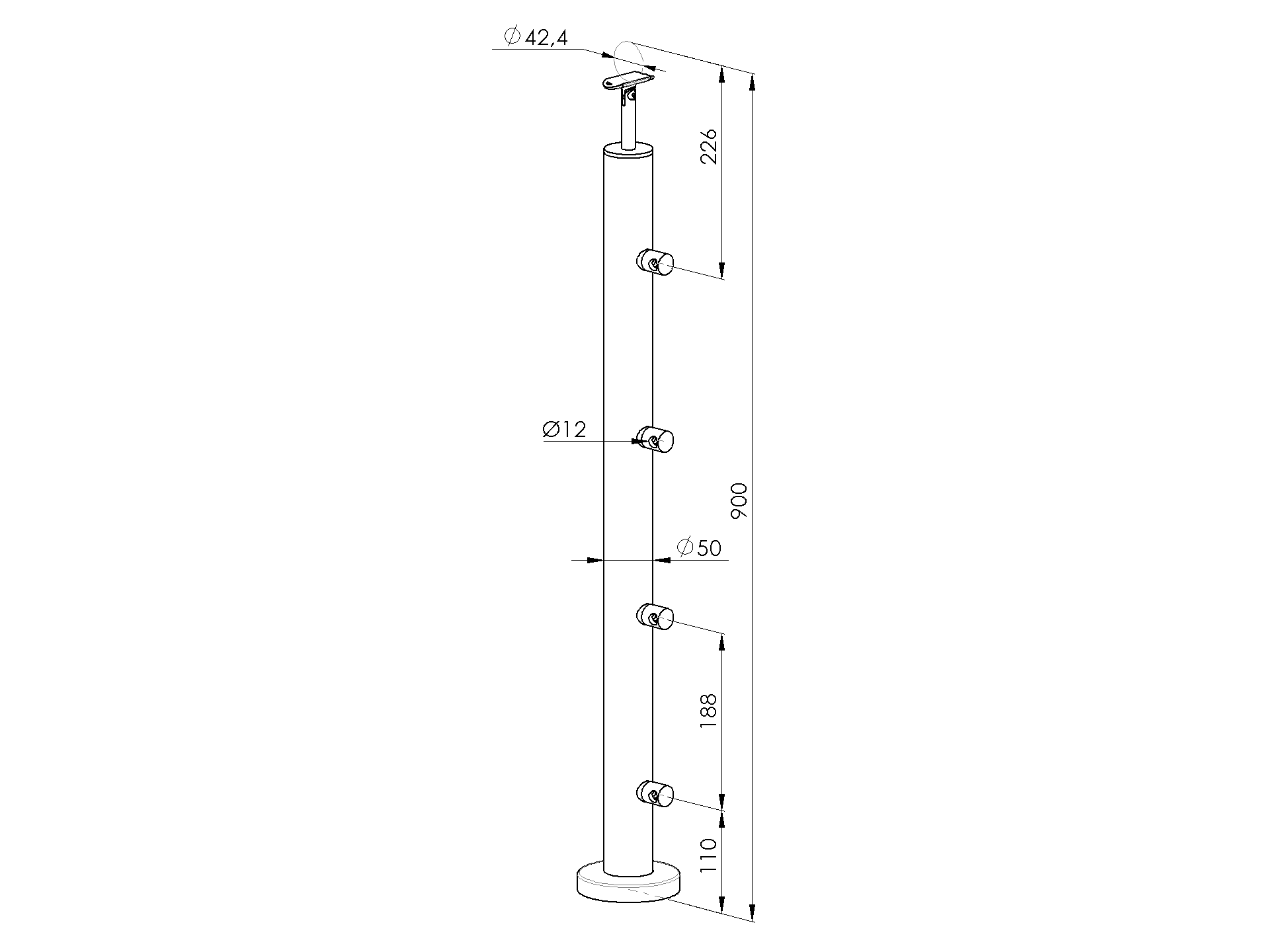 Wooden post D50mm for handrail D42.4mm, top mounting horizontal filling 4 x d12 mm. Designed for straight railing height of 90 cm, for installation with a maximum span of up to 3 m. Possibility to adjust the slope of the filling and handrail. Stainless steel components with brushed finish.