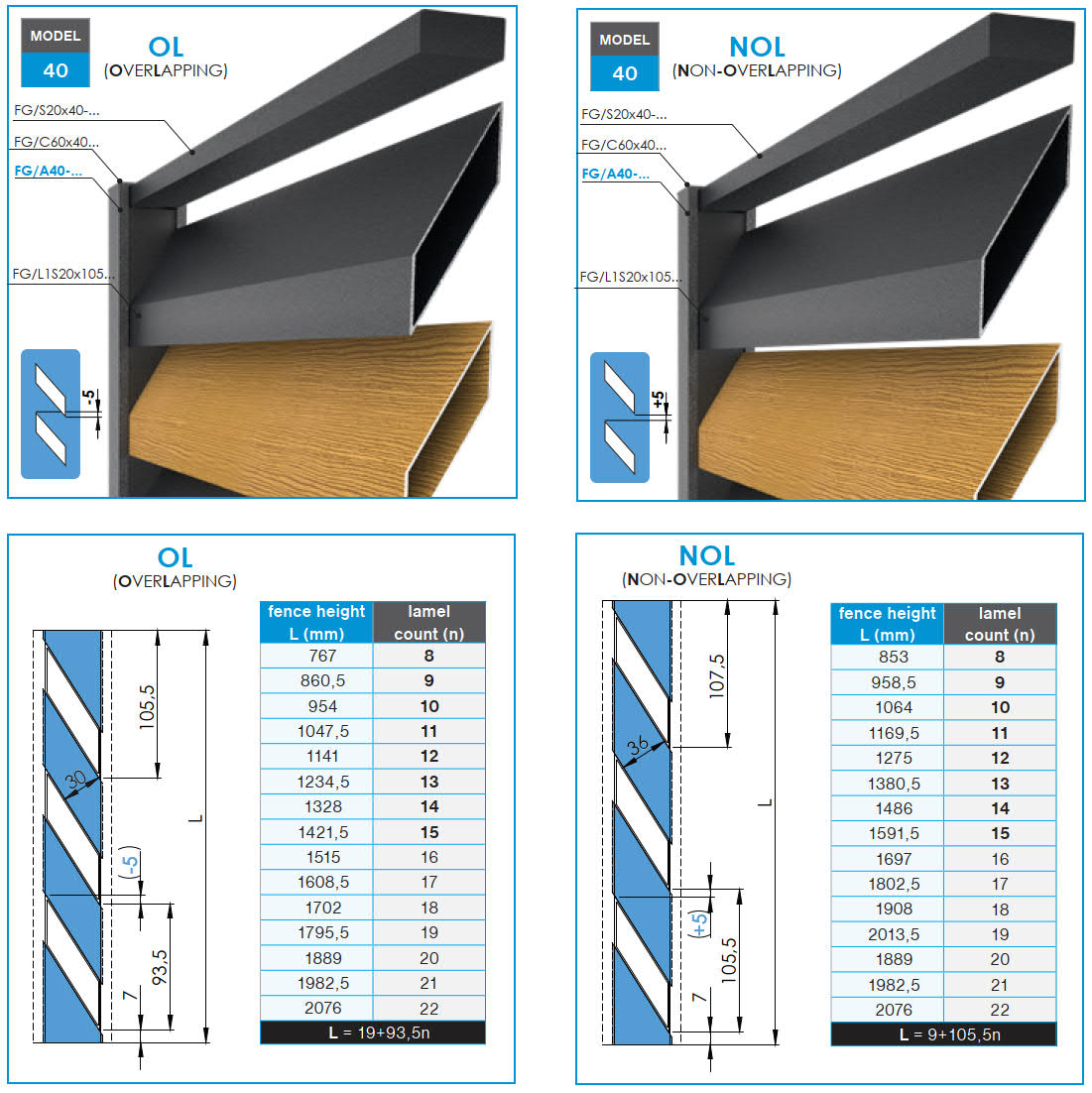 Complete set of slanted distance cover strips for the MOUNT L2 system. With this set, you can assemble a fence panel with a maximum height of 1047.5 mm. The slats are installed with a 5 mm gap, which ensures partial transparency of the fence panel..