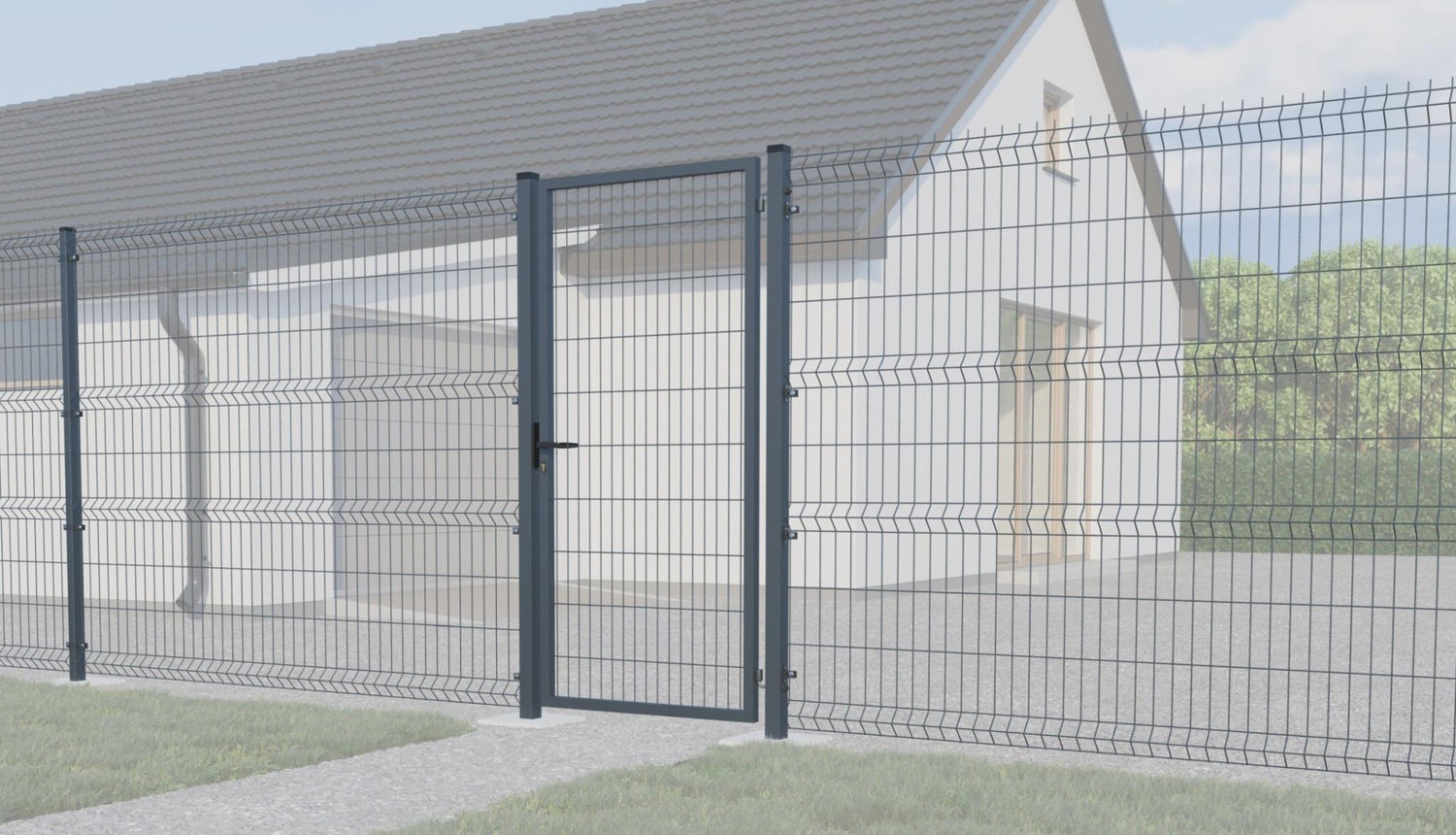 Riempimento del cancello rete saldata. Dimensione della maglia 200x50mm. Diametro del filo 4mm. Profilo dei pali 60x60x2mm. Altezza dei pali 2500mm. Profilo del telaio 40x40x1,5mm. Finitura superficiale: zinco + RAL 7016 antracite. La confezione include anche la parte della serratura e la maniglia.