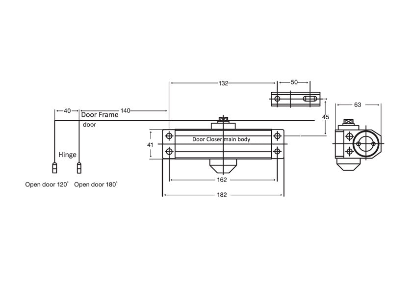 Chiudiporta con regolazione continua della chiusura 180°-15° e 15°-0°, dimensioni 182x41x63mm. Larghezza massima della porta 900mm, peso della porta fino a 60kg.