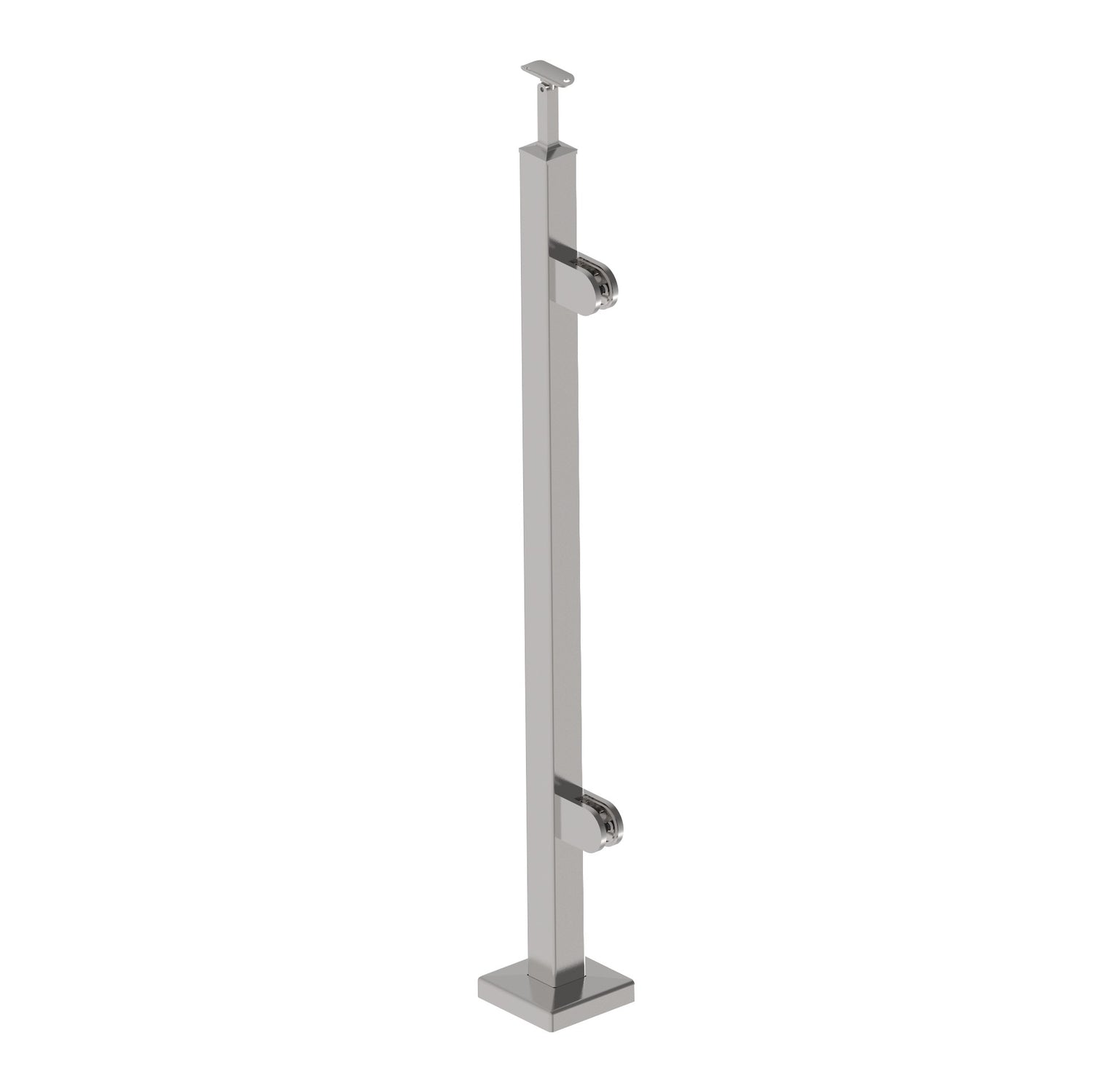 Montante quadrato in acciaio inox con flangia di ancoraggio saldata e rosetta di copertura. Il montante include un supporto regolabile per il corrimano e supporti per vetro (per vetro di spessore 8,76 mm). Viene utilizzato per realizzare una ringhiera in vetro alta 1000 mm come montante terminale. Il materiale di ancoraggio non e incluso.