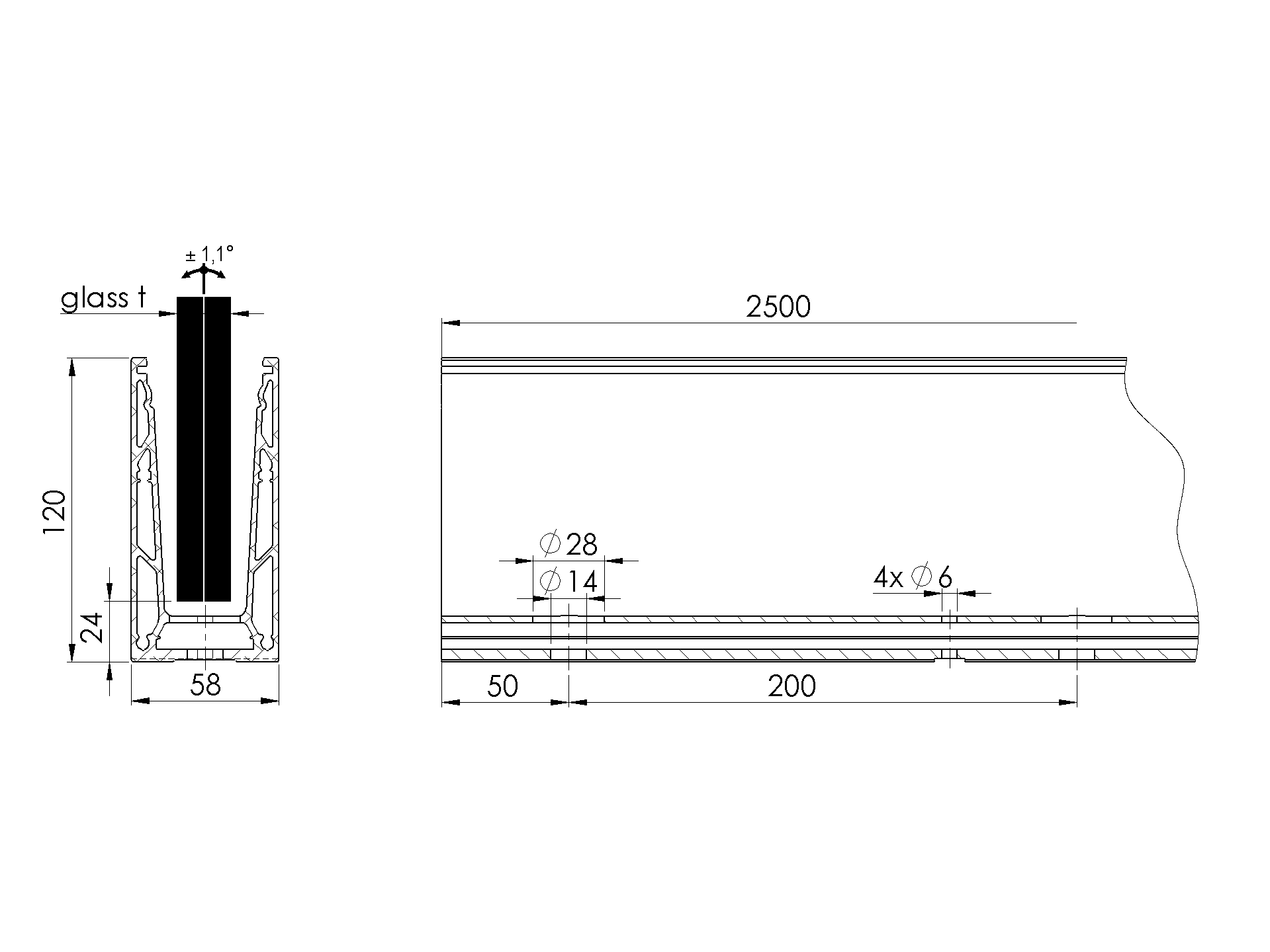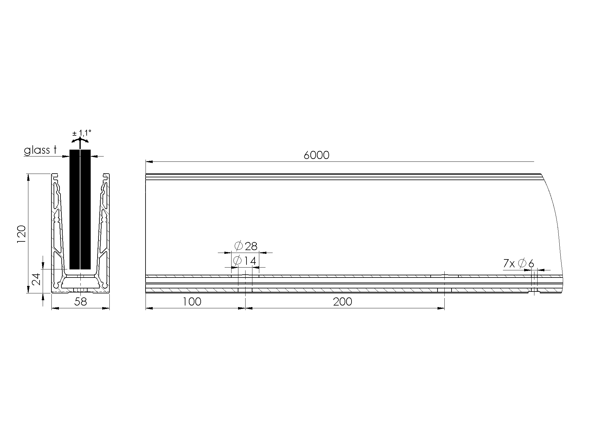 Parapetto in vetro intero-profilo cavo-ancoraggio superiore AL/0004-LIGHT-6000-S-E