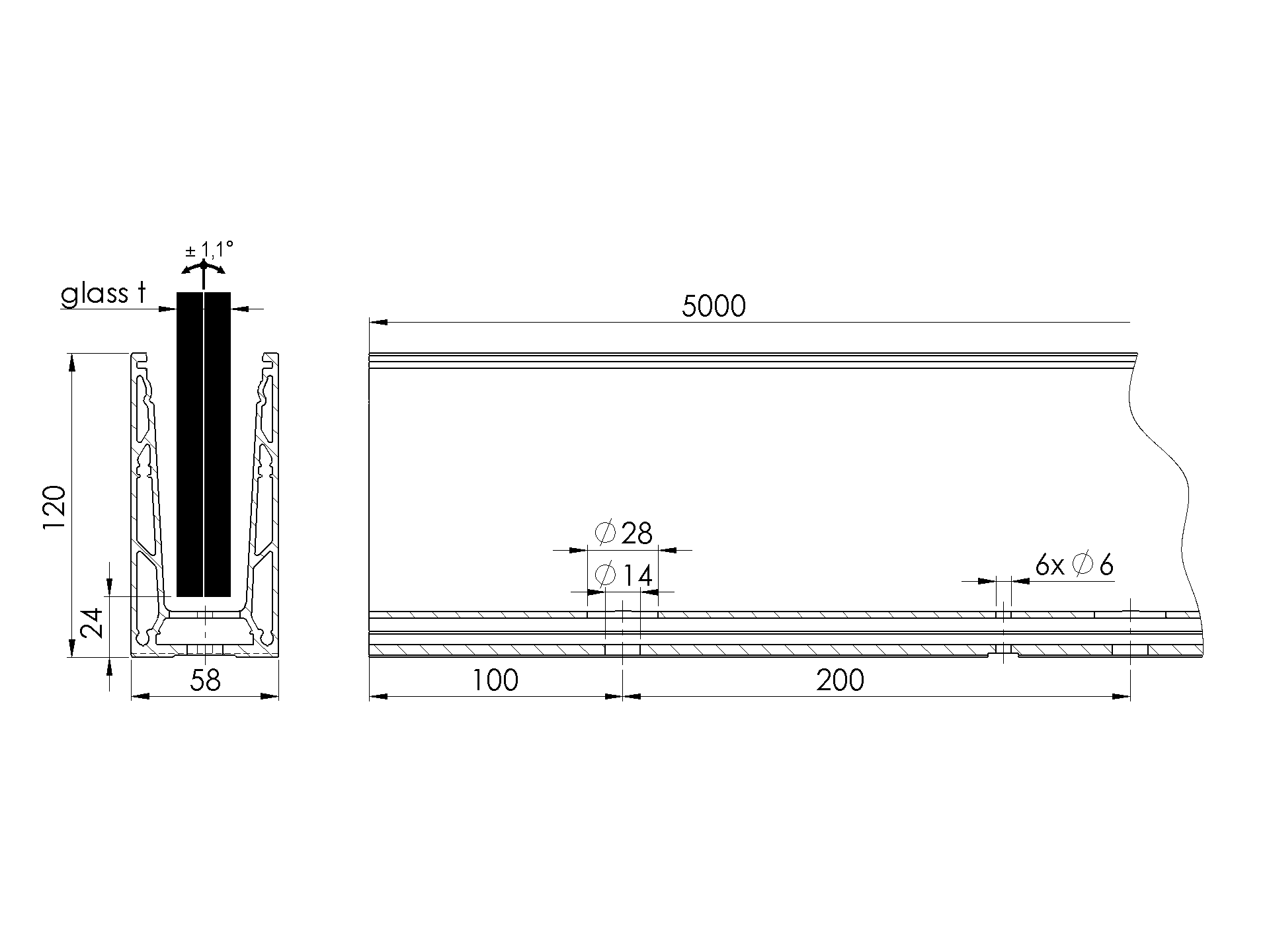 Parapetto tutto in vetro-profilo cavo-fissaggio superiore AL/0004-LIGHT-5000-S-E