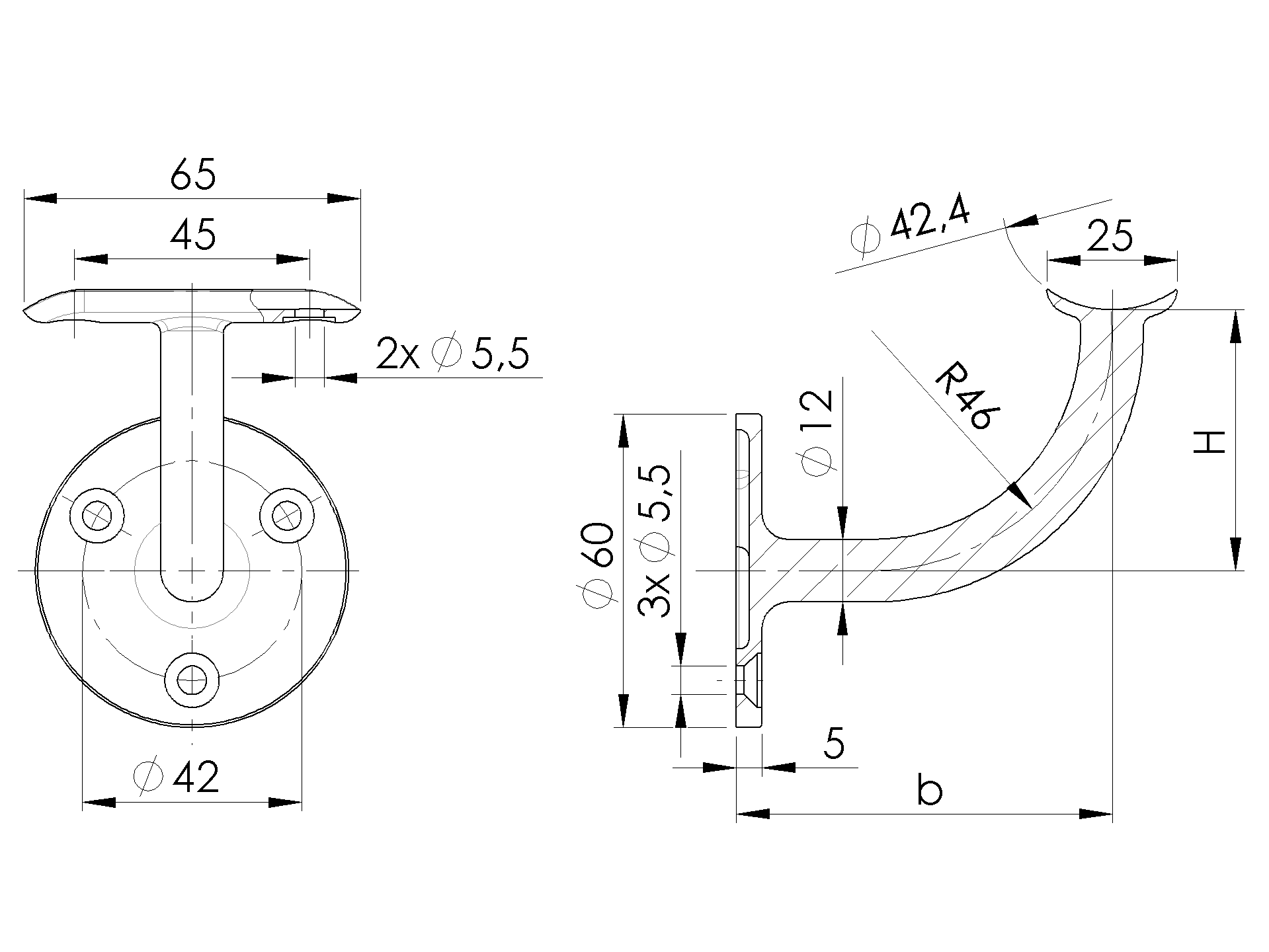 Materiale: Acciaio inossidabile AISI 304, Finitura: Satinato, Corrimano: D42,4, Ancoraggio: Su parete, b: 75, H: 50